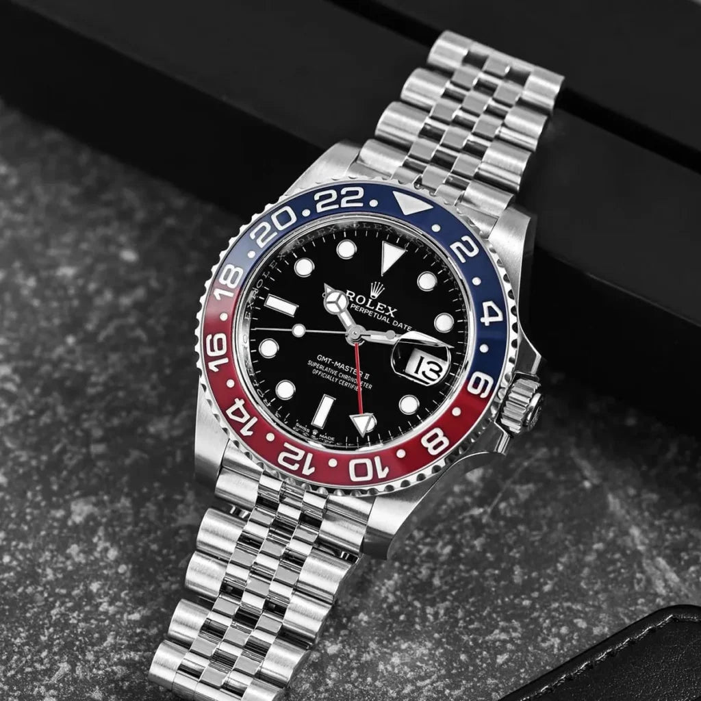 •"Pepsi" Cerachrom Bezel: Bidirectional, 24-hour graduated bezel in vibrant red and blue ceramic, a signature of the GMT-Master II.